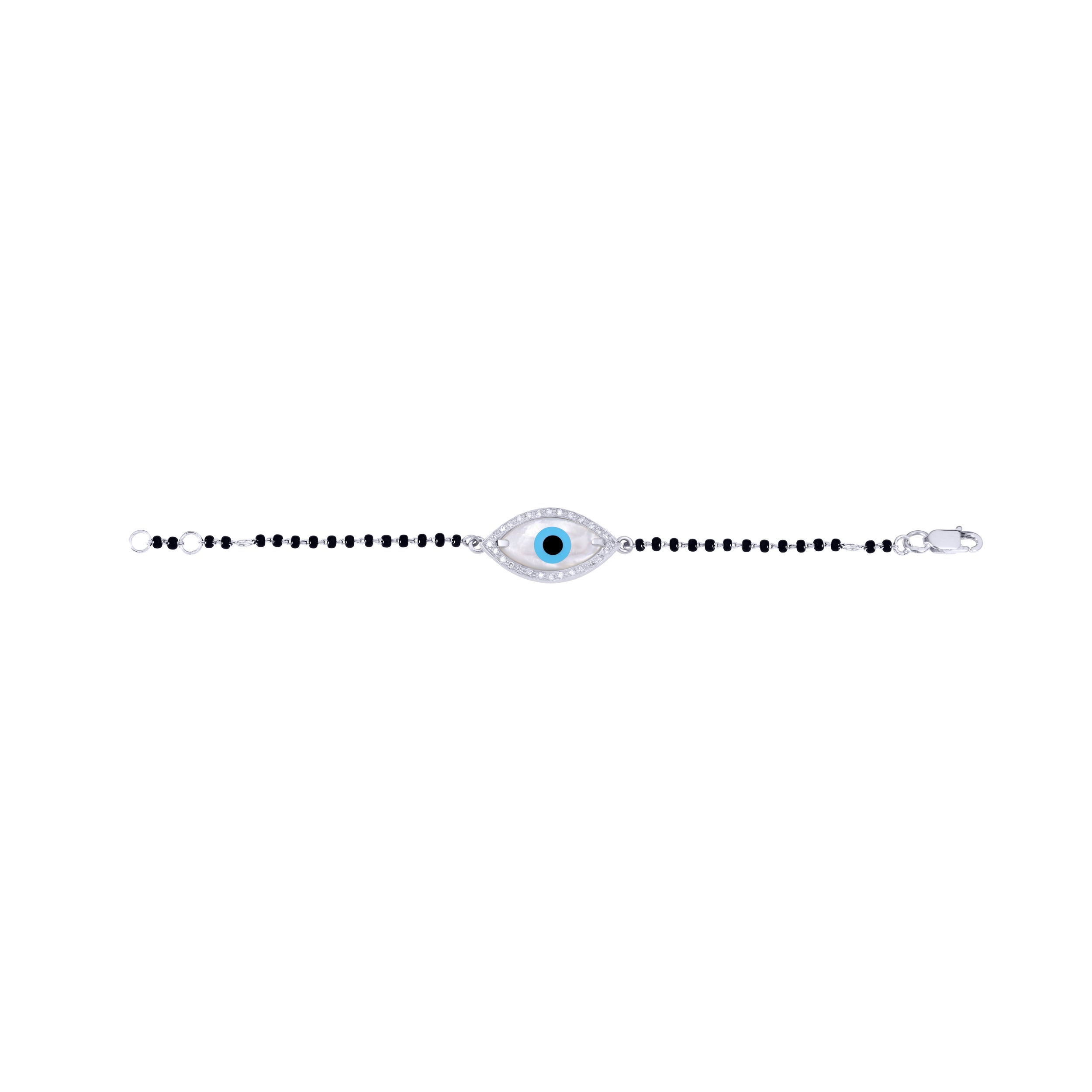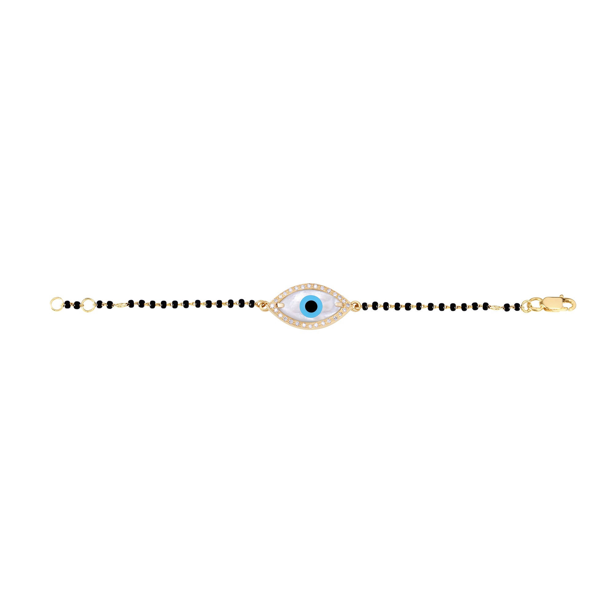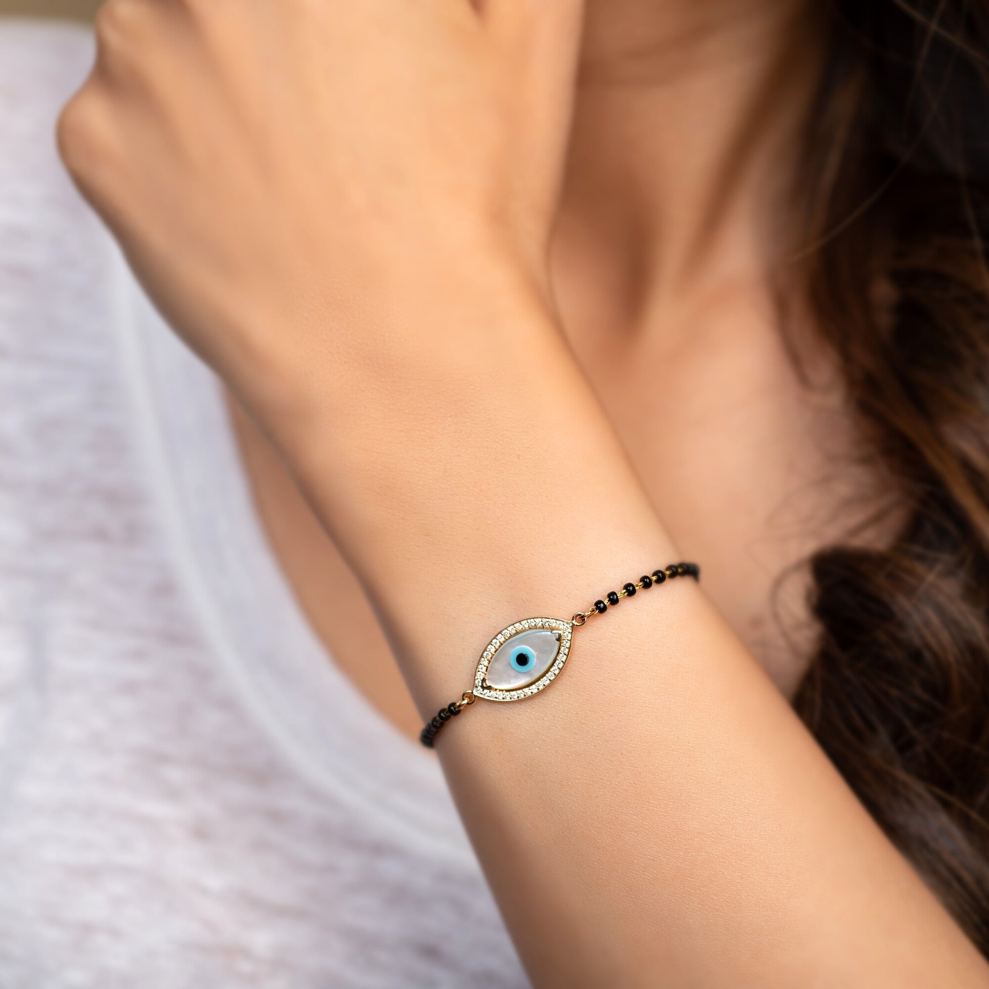 - Small Marquise (15 mm) Mother of Pearl Evil Eye and Diamond Bracelet with Traditional Black Nazar Beads